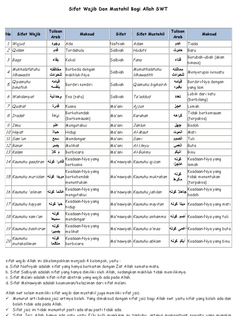 Sifat wajib allah tulis an arab arti jenis sifat sifat mustahil allah tulis an arab arti 1 wujud ﻭﺟﻮﺩ ada nafsiah adam ﻋﺪﻡ tiada 2 qidam ﻗﺪﻡ.